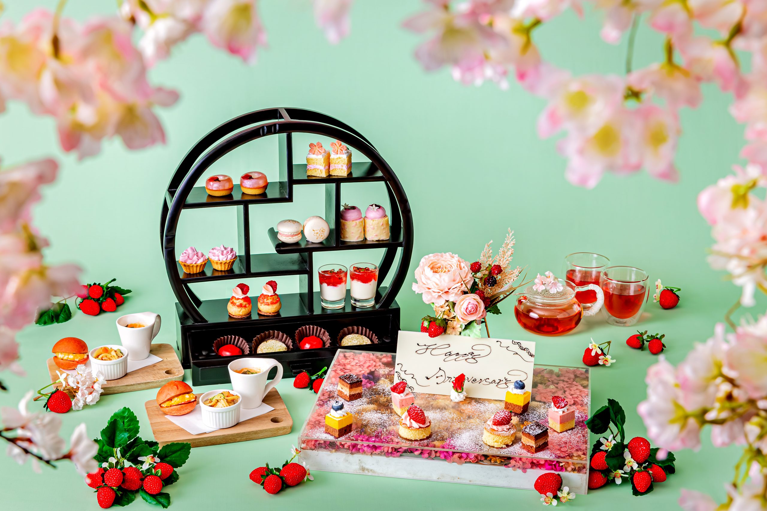華やかな桜が誘う、優雅なさくらアフタヌーンティーに、お好きなメッセージを添えた華やかなフラワープレートをお付けします。大切な方への感謝の気持ちや特別な日のお祝いを、春の訪れを感じる桜の美味しさと共に心に残る思い出として。ティーフリーフロー付きで、清らかで贅沢なひとときをお過ごしください。