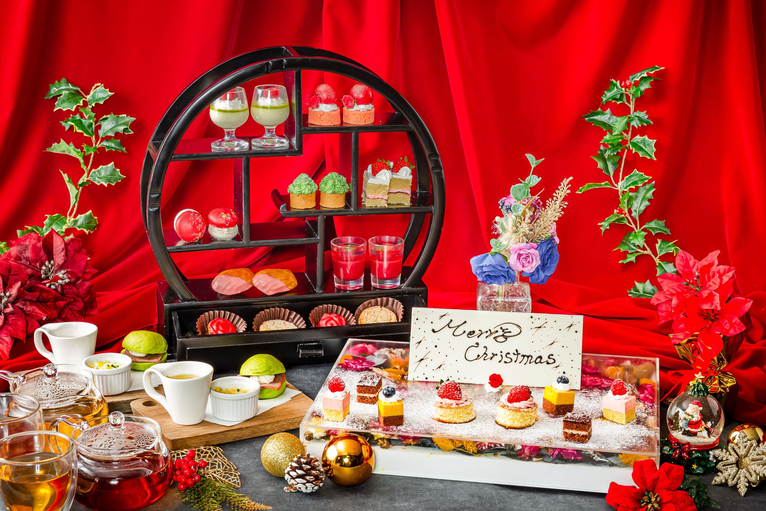 クリスマスをモチーフにしたスイーツに、メッセージ付きフラワープレートを添えた、期間限定の特別なアフタヌーンティー。